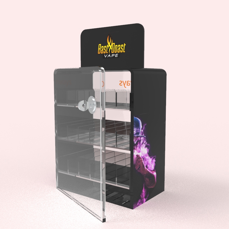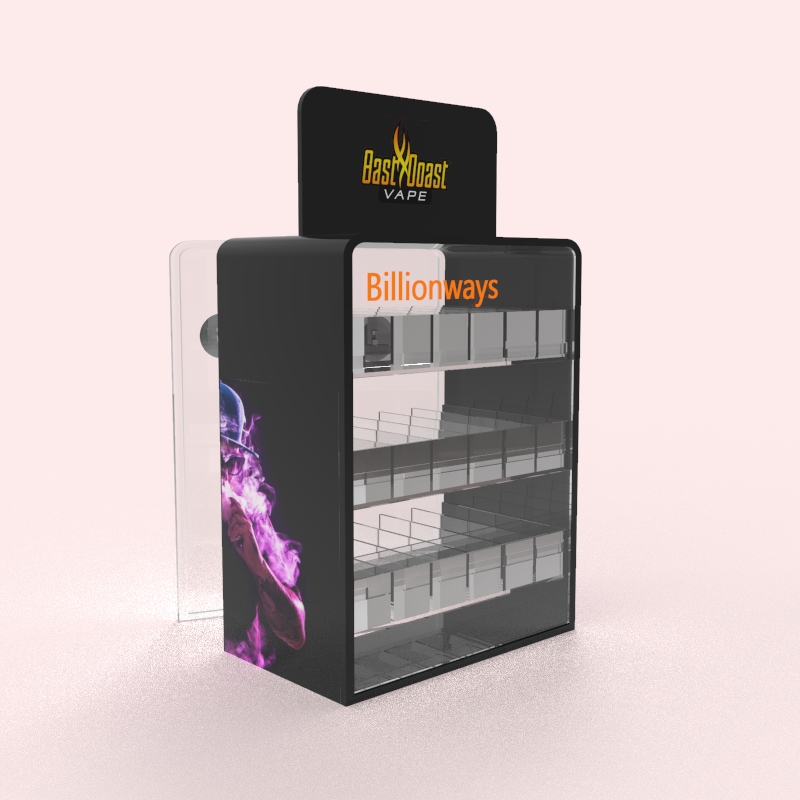 Above is our acrylic counter-top vape display stand with lock, it's a three layers vape display stand with a back door can be open and locked, the retail store shop keeper can open this door and manage the vape goods in this display stand easily.